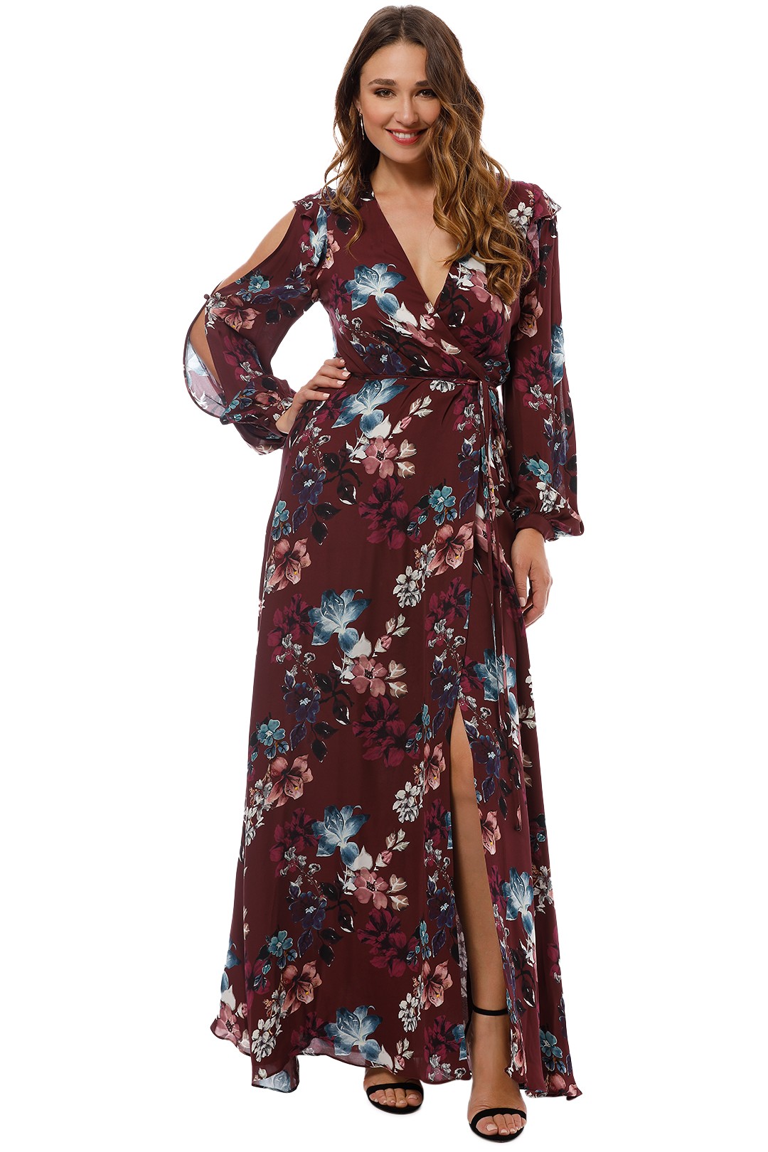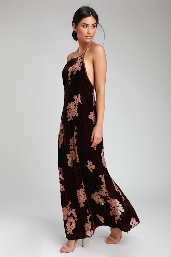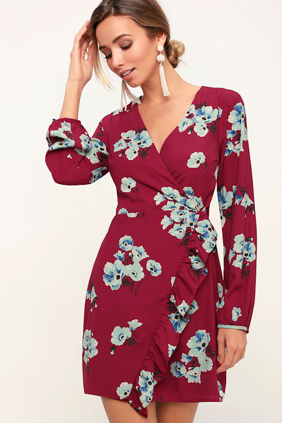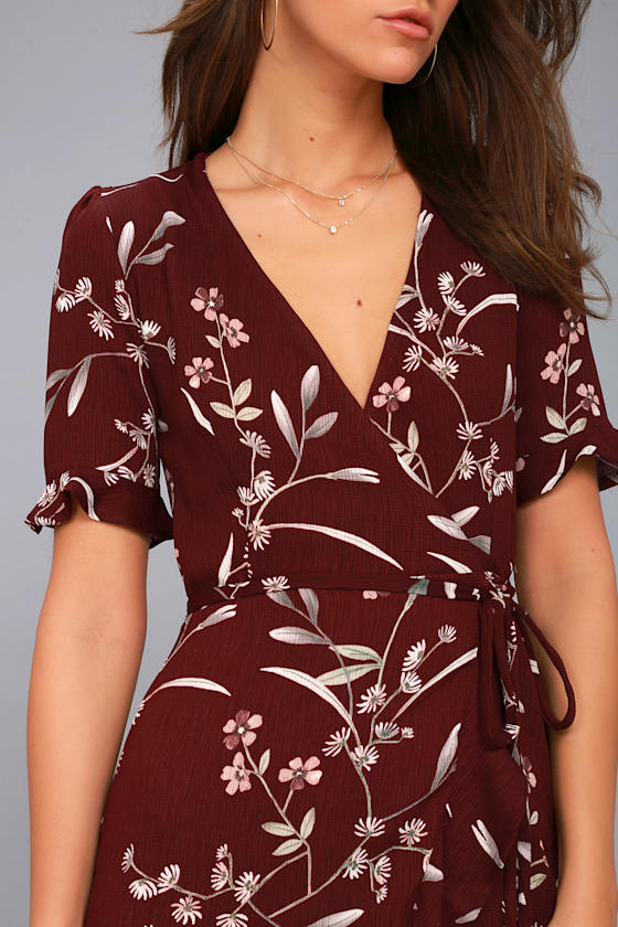 put on a smile burgundy floral print satin wrap maxi dress sale